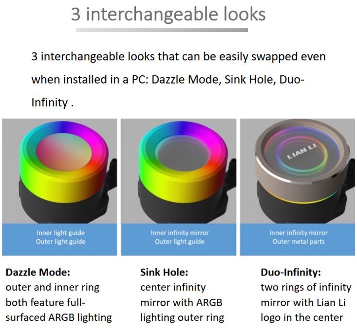 Παράλληλα με τη φανταστική απόδοση ψύξης, η Lian Li Galahad II Trinity SL-INF AiO διαθέτει επίσης υπέροχη αισθητική. Υπάρχουν τρία καπάκια ARGB για την αντλία CPU, καθένα από τα οποία προσφέρει το δικό του μοναδικό στυλ. Το πρώτο καπάκι ονομάζεται Duo-Infinity, το οποίο περιλαμβάνει περίβλημα από αλουμίνιο που περιβάλλει έναν όμορφο καθρέφτη απείρου κάλλους, με το λογότυπο της Lian Li στο κέντρο. Ακολουθεί το καπάκι Dazzle, το οποίο διαθέτει δύο ξεχωριστές περιοχές φωτισμού, ένα περίβλημα diffuser φωτός ARGB και ένα στο κέντρο του καπακιού, ώστε να μπορούν να εμφανίζονται ταυτόχρονα δύο διαφορετικά χρώματα. Τέλος, το Sink-Hole συνδυάζει τα δύο σχέδια, με το περίβλημα του diffuser ARGB και ένα κέντρο με καθρέφτη απείρου, δημιουργώντας ένα κομψό εφέ φωτισμού.